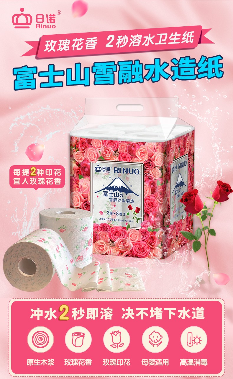 日諾日本進口玫瑰花香卷筒紙印花衛(wèi)生紙可溶水溶廁紙有芯卷紙8卷