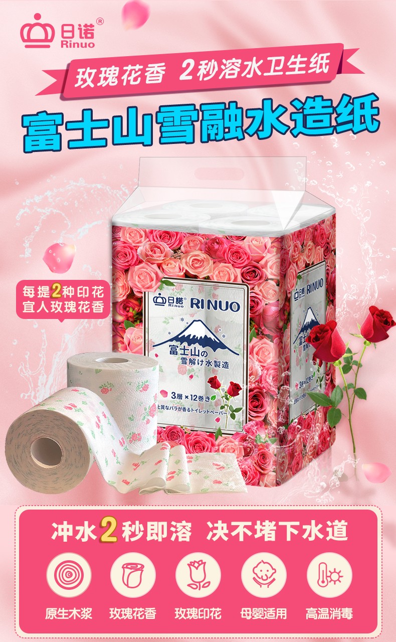 日諾日本進(jìn)口玫瑰花香卷筒紙印花衛(wèi)生紙可溶水溶廁紙有芯卷紙1提