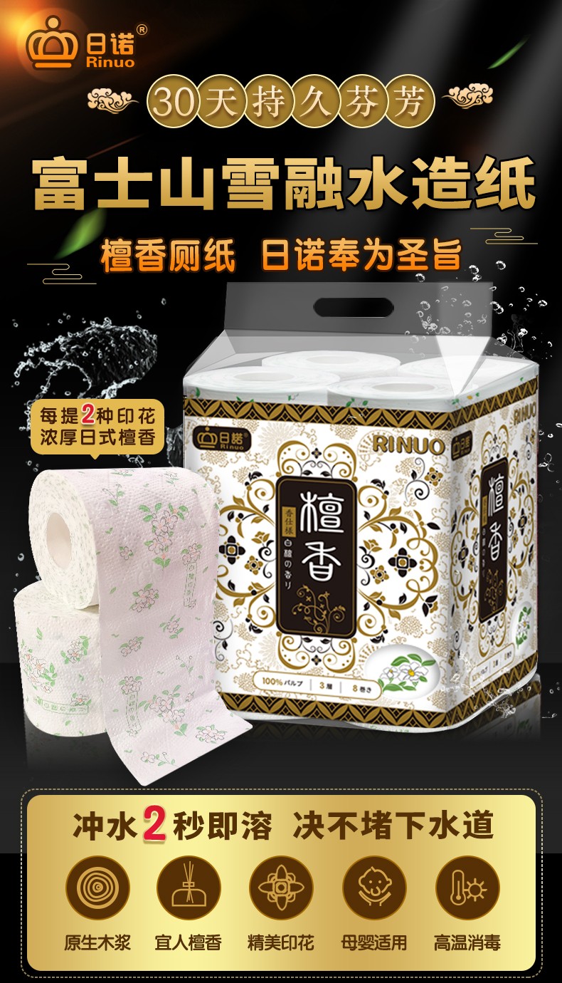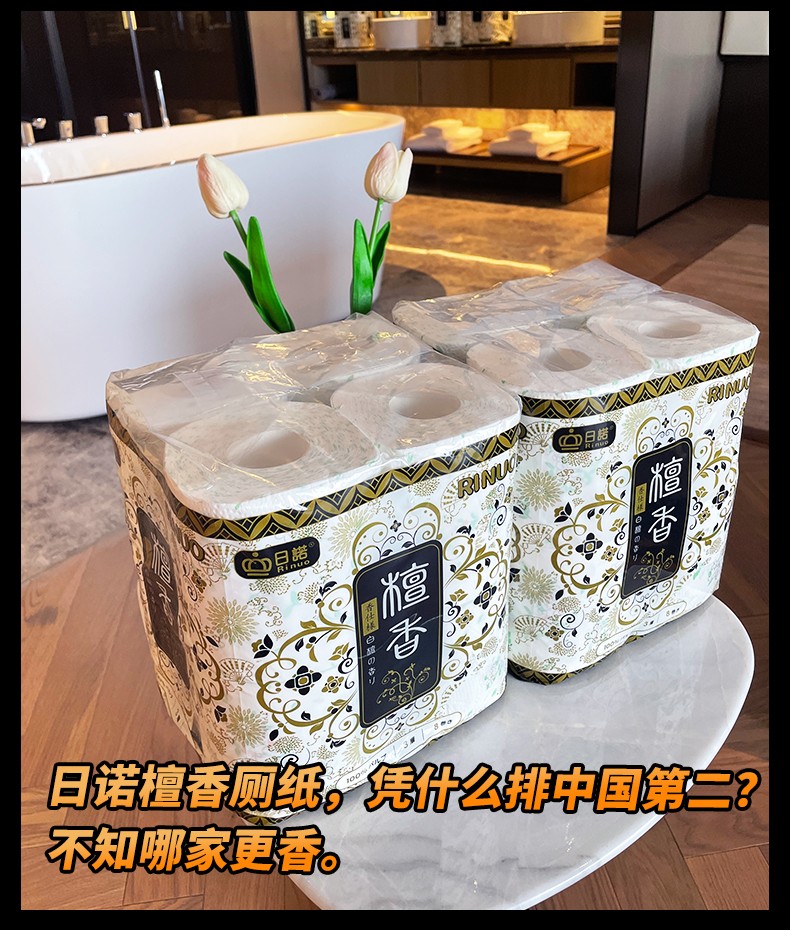 日諾日本進口檀香印花衛(wèi)生紙卷筒紙可溶水速溶廁紙有芯卷紙巾8卷