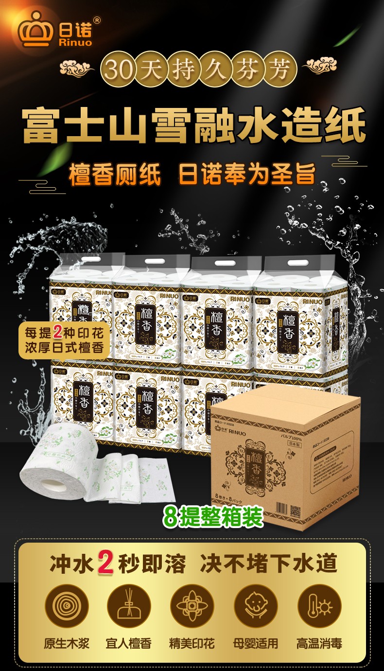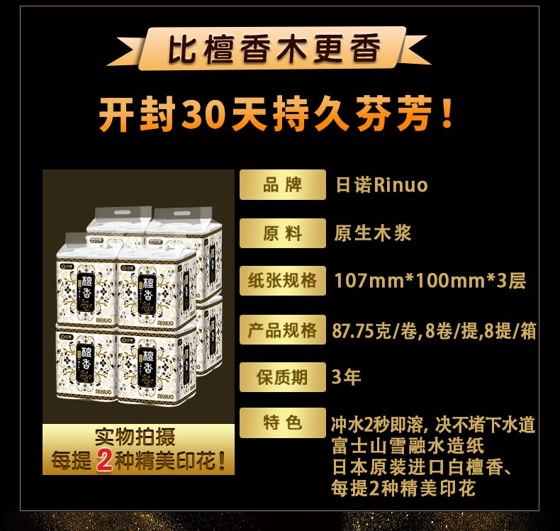 采購(gòu):日諾日本進(jìn)口檀香印花衛(wèi)生紙卷筒紙可溶水速溶廁紙有芯卷紙巾8提