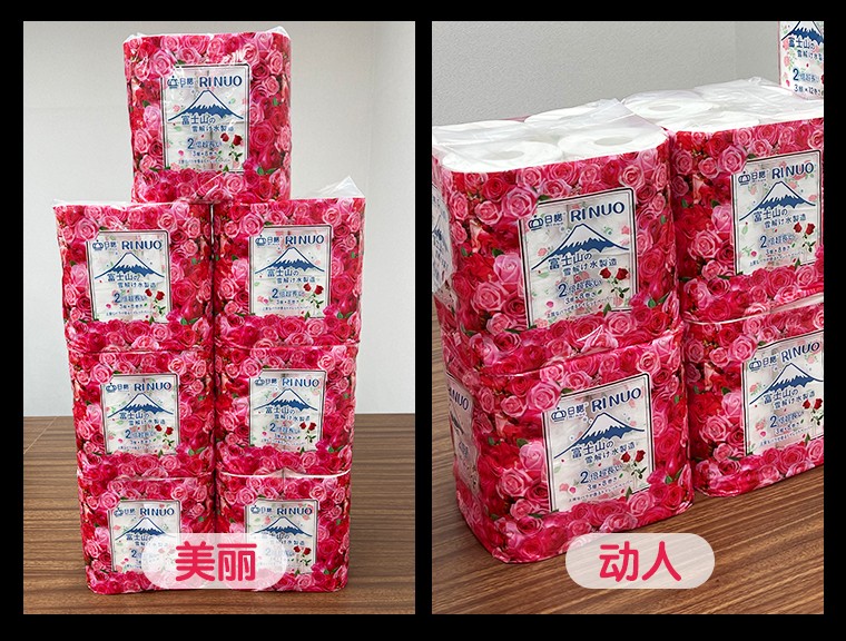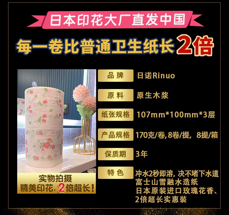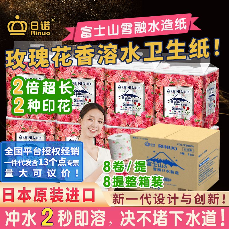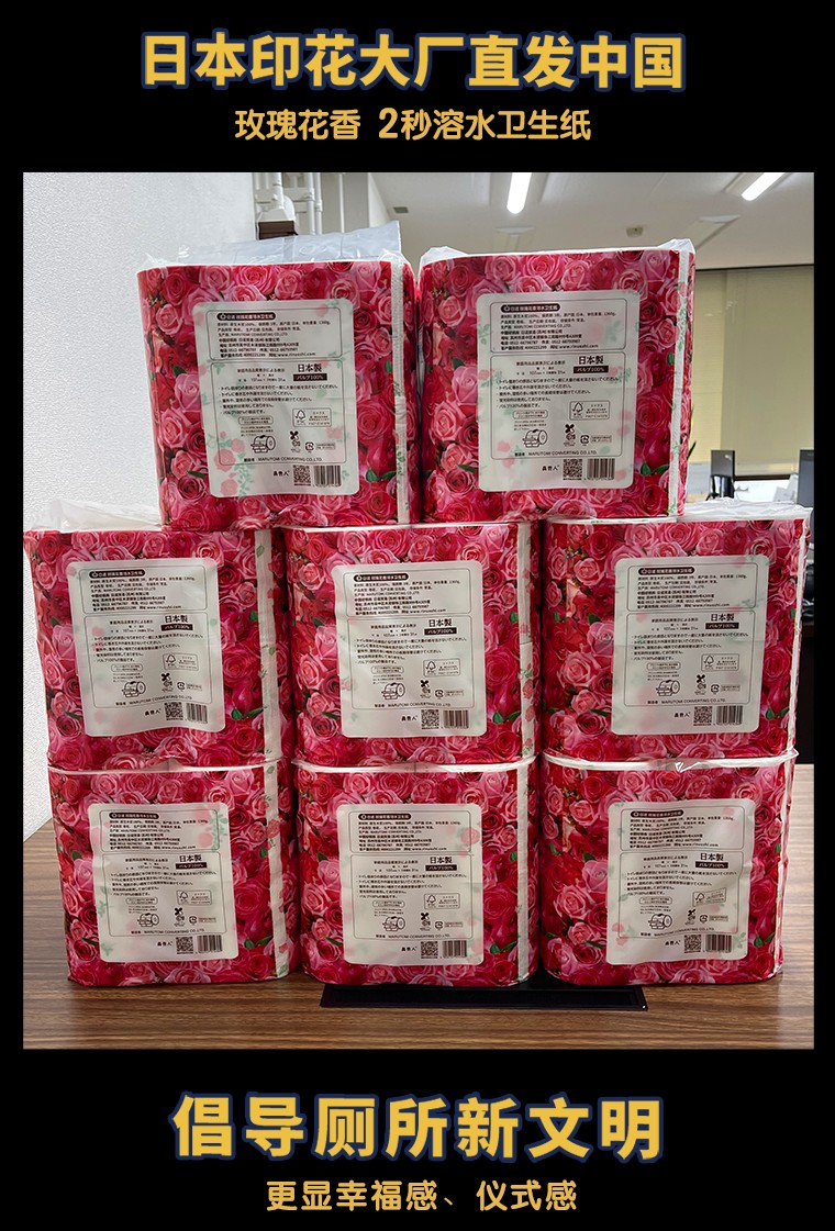 日諾日本進口有芯卷筒紙8提水溶卷紙玫瑰印花速溶衛(wèi)生紙1箱