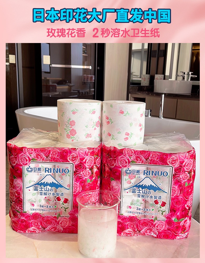 日諾日本進口玫瑰花香卷筒紙印花衛(wèi)生紙可溶水溶廁紙有芯卷紙8卷