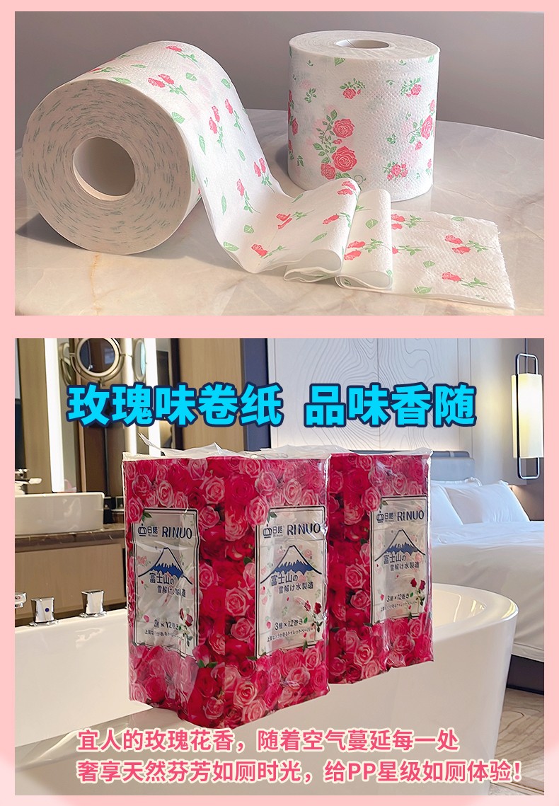 采購(gòu):日諾日本進(jìn)口玫瑰花香卷筒紙印花衛(wèi)生紙可溶水溶廁紙有芯卷紙1提