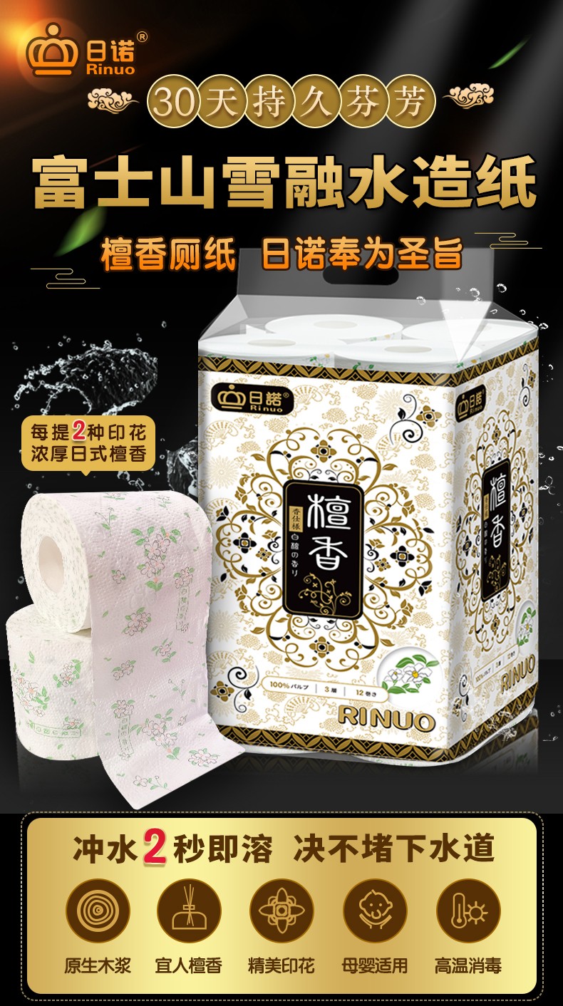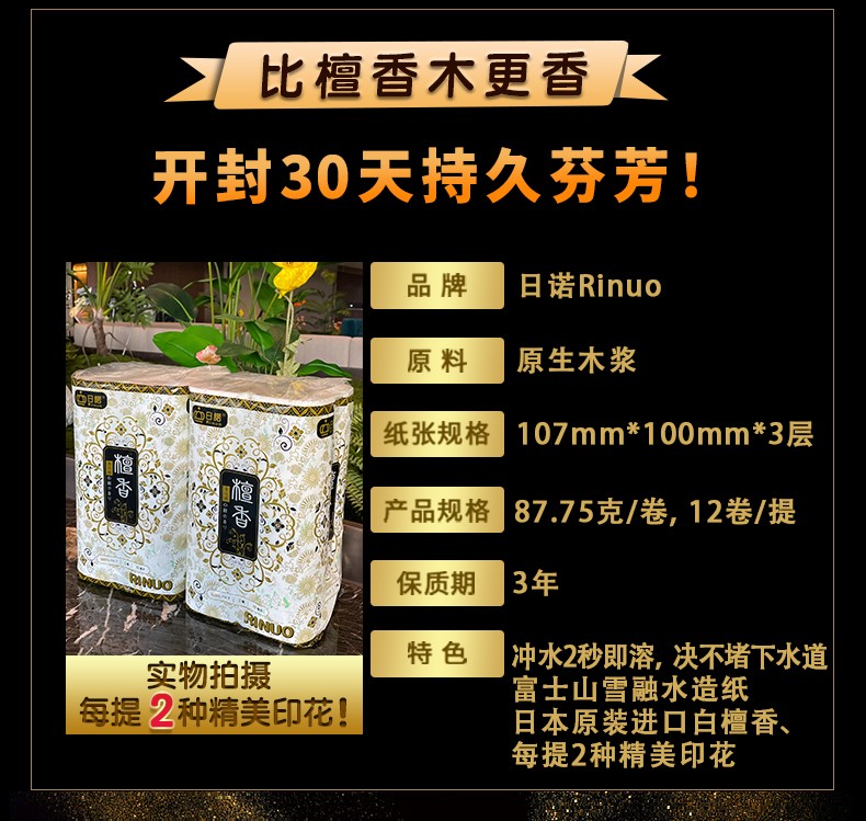 采購:日諾日本進(jìn)口檀香印花衛(wèi)生紙卷筒紙可溶水速溶廁紙有芯卷紙巾1提